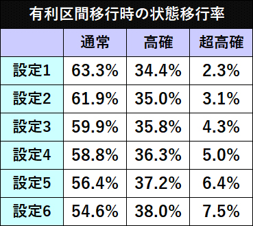 有利区間移行時(設定変更後やボーナス/AT終了時)の移行率に設定差あり。