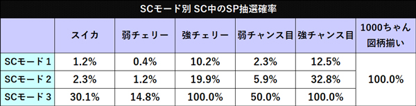 SCにはAT「1000★PARTY」(SP)の抽選確率が異なる3種類の「SCモード」が存在することが分かった。