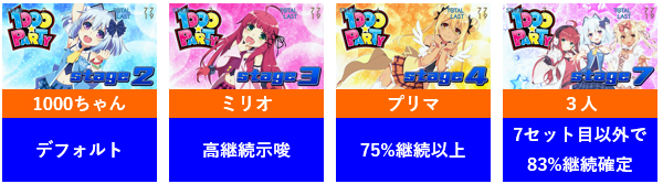 レア小役による「1000★PARTY」突入期待度が判明。弱チェリー<スイカ<弱チャンス目<強チェリー<強チャンス目の順に期待度アップ。1000ちゃん図柄揃い時は突入確定!?
