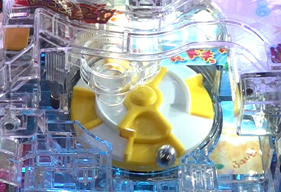 回転体の黄色いエリアに玉が乗れば突破となりスタート入賞で変動が開始。最終的に液晶内で図柄が揃えば大当りとなる。