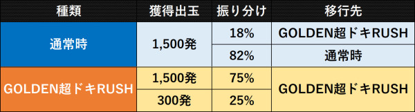 GOLDEN超ドキRUSHは継続率 約89%で、大当りは75%が1,500発獲得可能。突入時の期待出玉は約11,000発となっている。