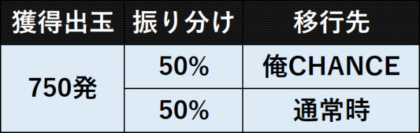 750発獲得可能な大当りで、ジャッジ演出に成功すればST8回転の俺CHANCEへ突入。なお、失敗した場合は通常時へ移行する。●大当りの振り分け(通常時・特図1)
