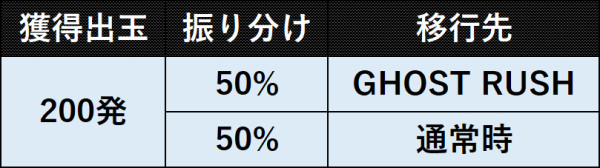 200発獲得可能な3R大当りで、演出に成功すればラウンド終了後に「GHOST RUSH」へ、失敗した場合は通常時へ移行する。●大当りの振り分け(通常時・特図1)