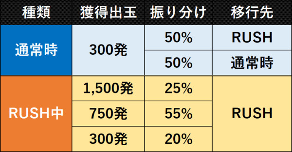 通常時の図柄揃い後は300発獲得可能な強欲チャレンジBONUSへ突入し、ラウンド終了後の強欲チャレンジに成功すればST120回転のRUSHへ突入。なお、失敗した場合は通常時へ移行する。●大当りの振り分け