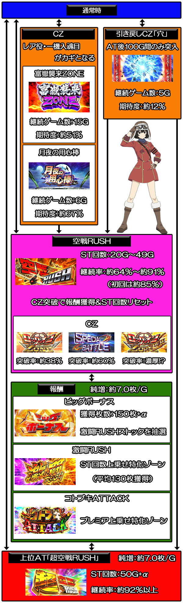 本機は、STとボーナスのループで出玉を増やす「空戦RUSH」で展開され、ST回数を上乗せすることで継続率を上げていく自力感の高いゲーム性が特徴となっている。