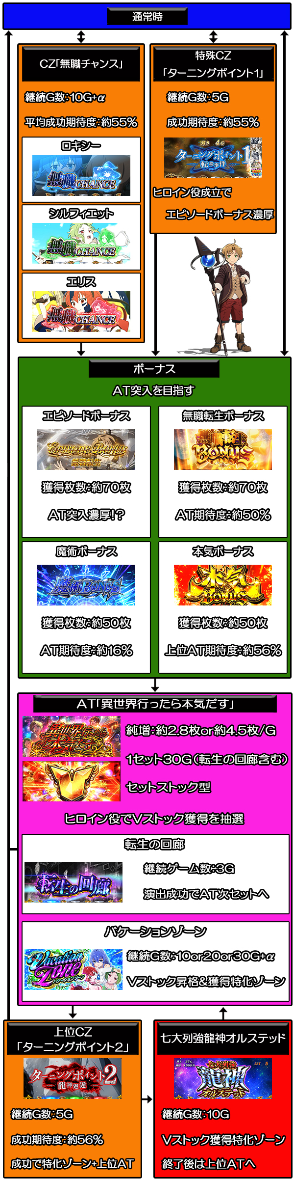 基本仕様は、1ゲーム約2.8枚or約4.5枚純増のAT機。本機は、いつでもパネルに対応したヒロイン役成立で大チャンスとなる誰でもわかりやすいゲーム性と、1つのVストックから期待感が無限に広がるAT「異世界行ったら本気だす」の性能に注目。