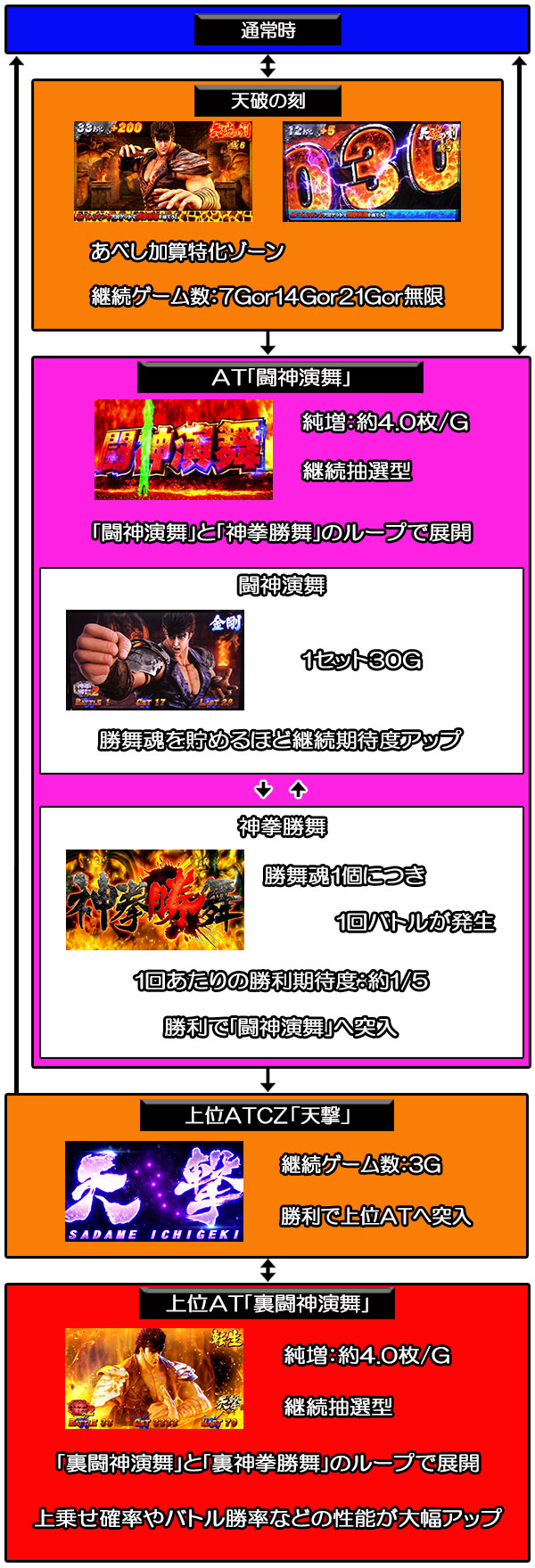 通常時は、規定あべし到達でAT「闘神演舞」に突入。AT中は勝舞魂を貯めるほど継続率がアップし、最終的に上位ATCZ「天撃」から上位AT「裏闘神演舞」突入を目指す。