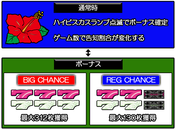 リール配列や通常時の制御・出目などの打感はそのままに、「BIG CHANCE:約312枚獲得」「REG CHANCE:約130枚獲得」と6号機ハナハナシリーズ最高のボーナス獲得枚数を実現している。