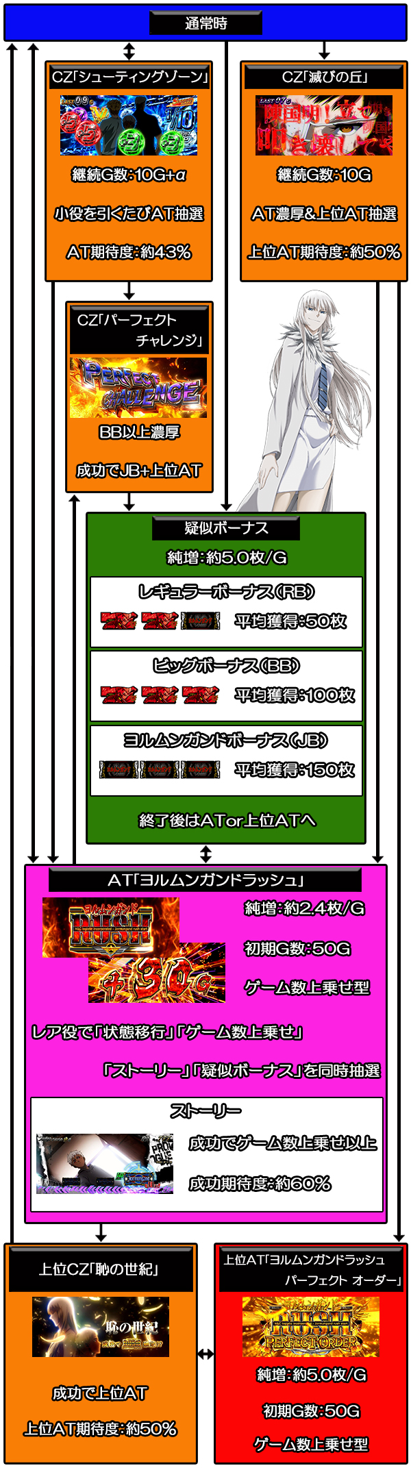 CZや疑似ボーナスなどからAT「ヨルムンガンドラッシュ」へ突入。多彩なルートから上位AT「ヨルムンガンドラッシュ パーフェクト オーダー」を目指す。