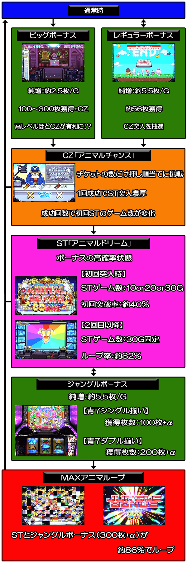 通常時は、ボーナス後のCZ「アニマルチャンス」成功でST「アニマルドリーム」へ突入。STとボーナスのループで出玉を増やす。