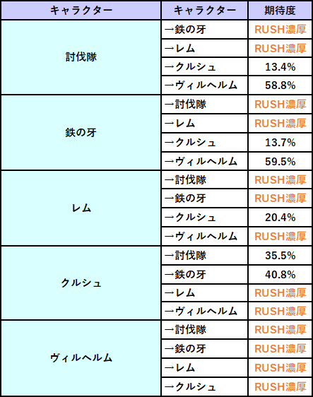 組み合わせに関わらず2ndATTACKで「レム」が選択されればRUSH濃厚。また、上記のほかに1stATTACKと2ndATTACKのキャラクターが同一でもRUSH濃厚。