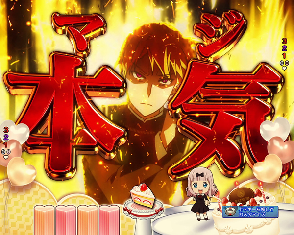 演出 内容 期待度 TOTAL 10.2% 点滅保留 0.3% キャラ保留(色保留) 青保留 5.6% 緑保留 26.1% 紫保留 42.0% 赤保留 78.1% 金保留 大当り濃厚 虹保留 大当り濃厚 傘保留 4.3% 相合傘保留 かぐや:緑 20.3% かぐや&白銀:赤 87.4% かぐや&白銀:虹 大当り濃厚