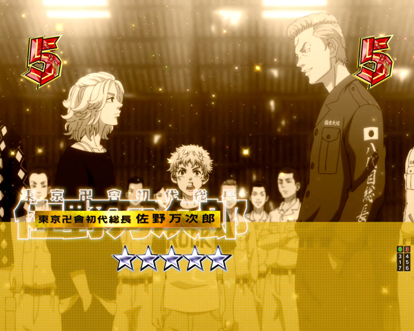 <バイクスタンバイ予告>内容 期待度 林田春樹 約25.3% 場地圭介 約25.5% 三ツ谷隆 約25.5% 龍宮寺堅 約44.9% 羽宮一虎 約44.9% 佐野万次郎 約94.1% 佐野万次郎 (幼少期) 大当り濃厚