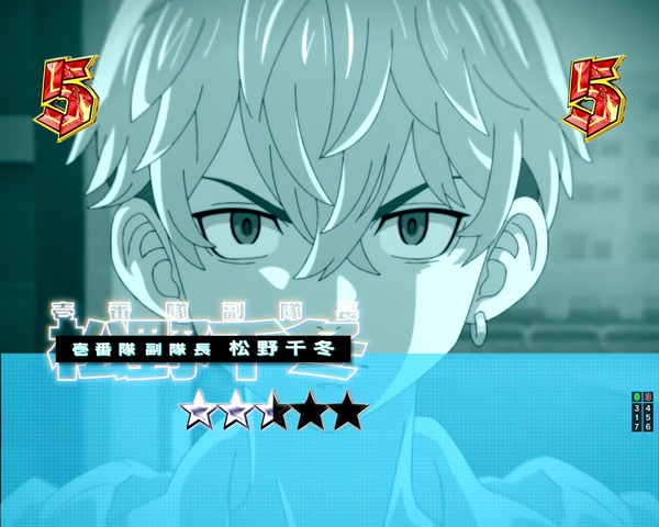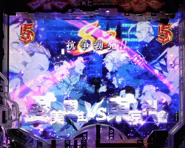 導入時チャンスアップ 演出 内容 期待度 役物LEDの色 通常 約46.7% 赤 約87.2% 導入タイトル 通常 約46.9% コミック調 約80.9% テロップ 白 約43% 赤 約92% 金 大当り濃厚 攻防煽りカット① 通常(松野千冬) 約42.9% 赤(柴八戒) 約74.4% 金(佐野万次郎) 大当り濃厚 攻防煽りカット② 通常(半間修二) 約40.8% 赤(龍宮寺堅) 約79.5% 金(佐野万次郎) 大当り濃厚