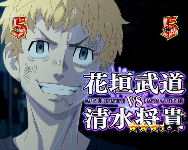 <佐野万次郎VS半間修二>佐野万次郎VS半間修二 演出 内容 期待度 TOTAL 約86.0% タイトル 通常 約85.6% 赤 大当り濃厚 カットイン(半間⇒マイキー) 通常⇒通常 約79.0% 赤⇒通常 約97.9% プレミアム 大当り+芭流覇羅(バルハラ)決戦突入濃厚