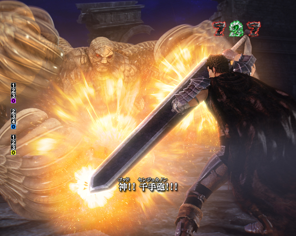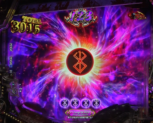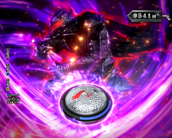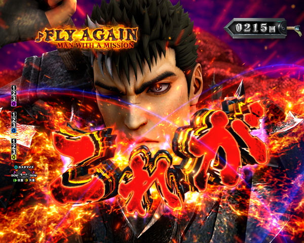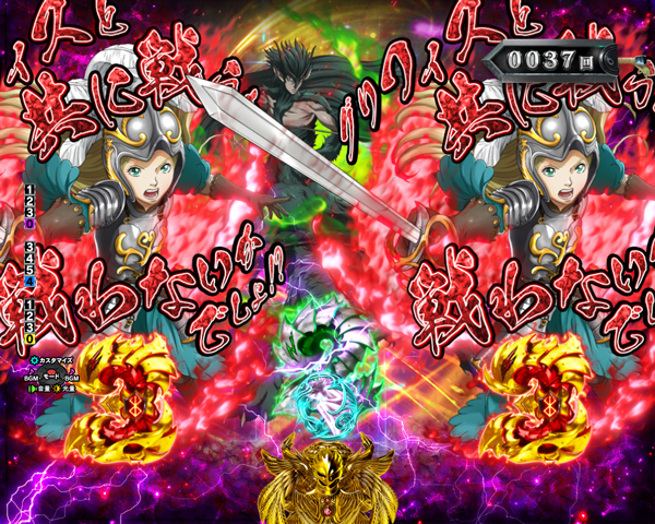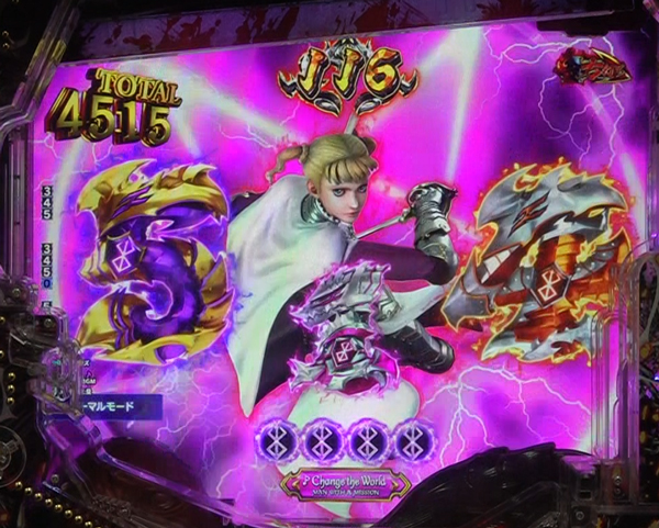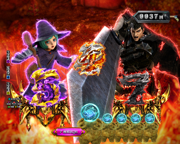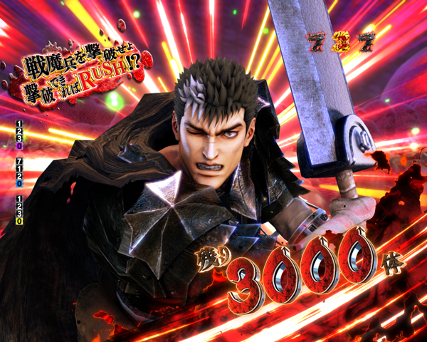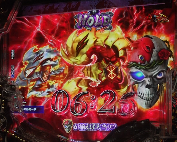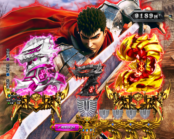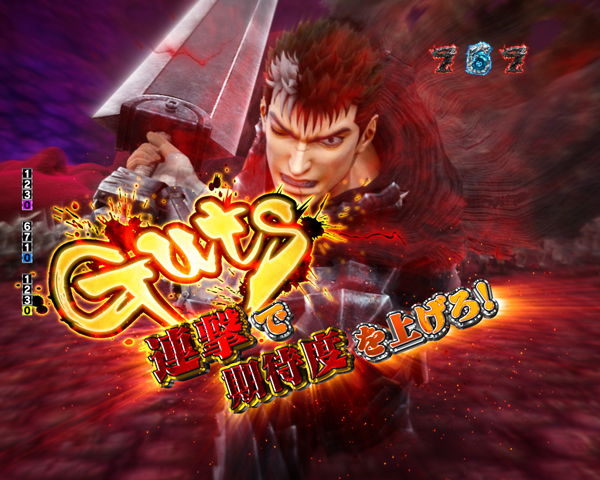 演出 内容 TOTAL期待度 放魔RUSH中 放魔RUSH真紅中 勝利期待度 星2 約6% 約13% 星5 大当り濃厚 大当り濃厚 ガッツor狂戦士 ガッツ 約4% 約10% 狂戦士 大当り濃厚 大当り濃厚 当落パターン ブッた斬れ!(ボタン1回押し) 約3% 約5% ブッ潰せ!(ボタン連打) 大当り濃厚 大当り濃厚