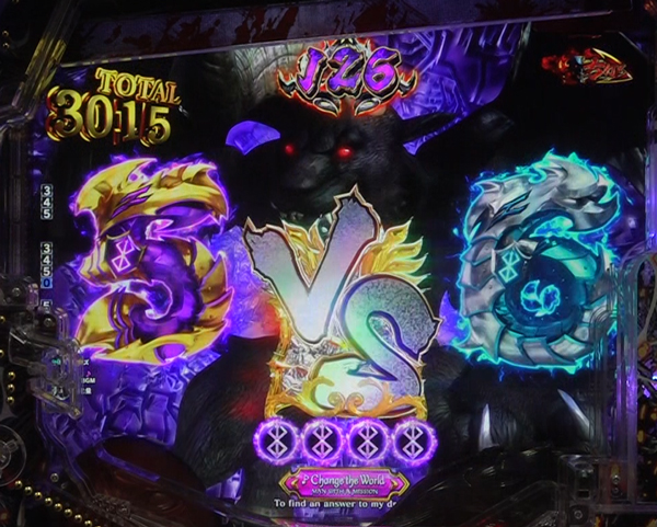 先読みで中図柄にVS図柄が停止。発展先を示唆しており、中図柄に停止してる敵と当該リーチになれば戦う。