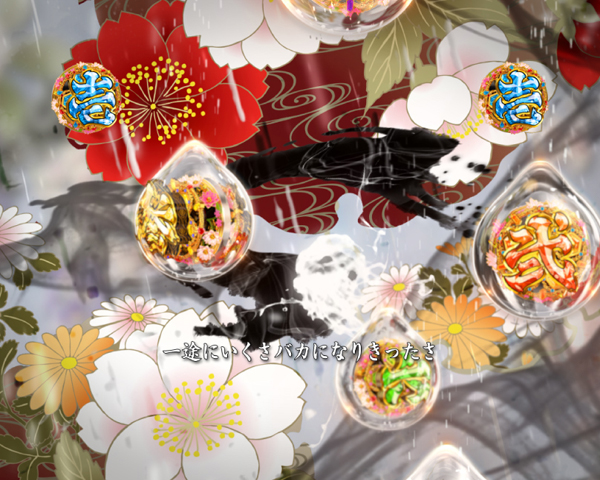 <手まり演出>内容 期待度 青 1.66% 緑 1.97% 赤 24.31% 慶次(赤) 44.36% -