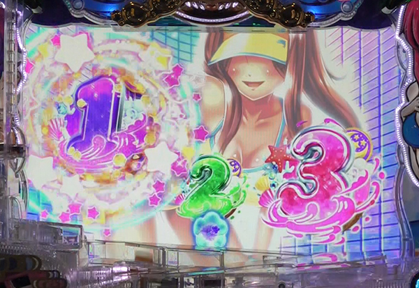 ビールボールのステップアップがハナちゃん⇒ナオミ⇒ナギサ⇒カナちゃん⇒全画面カットと進んでいく予告。ビーチボールの色が赤や金なら期待度アップ。ビーチボールSU予告
