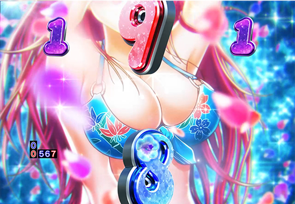 ビキニの形をした保留が紫や赤に変化すれば大当りのチャンス。プロカスタム時は、点滅保留が別の色に変化しないままなら大当り濃厚!?