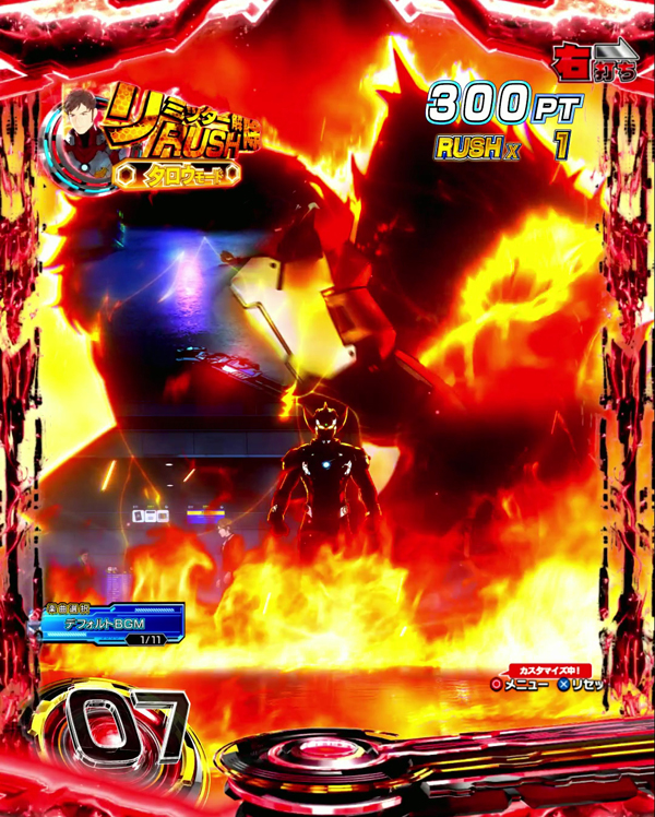 演出 内容 期待度 TOTAL 72.5% タイトル色 デフォルト 68.9% 赤 78.9% 金 大当り濃厚 テロップ色 デフォルト 68.2% 赤 78.2% 金 大当り濃厚 星数 3.5 70.3% 5 大当り濃厚 リミッター解除ルート突入煽り ※ 成功 81.7% タロウ登場シーン 金 大当り濃厚 競り合いカットイン 金 大当り濃厚 デバイス煽り⇒デバイスカットイン 発生 大当り濃厚 リーチ中CI 金EF⇒強カットイン 大当り濃厚 当落演出 ボタン+デフォルト文字 70.3% ボタン+赤文字 大当り濃厚 ボタン+金文字 大当り濃厚 レバー+デフォルト文字 大当り濃厚 レバー+赤文字 大当り濃厚 レバー+金文字 大当り濃厚 プレミアボタン 大当り+リミッター解除RUSH濃厚 ※発生した時点で成功濃厚