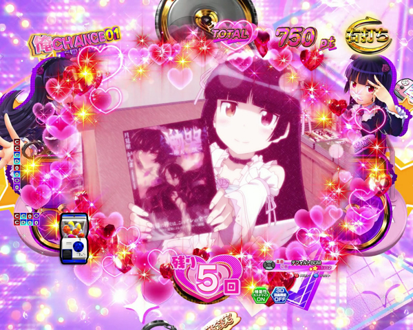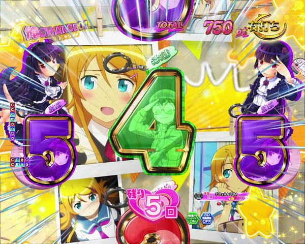 演出 内容 期待度 沙織(メガネあり) 「いざ参りましょう!」or「盛り上がってますな!」 20.0% 沙織(メガネなし) 「期待できますわ」 35.0% 「激熱ですわ」 92.0% 桐乃 デフォルト(心電図:弱) 40.0% チャンスアップ(心電図:強) 52.0% 黒猫 デフォルト(心電図:弱) 40.0% チャンスアップ(心電図:強) 63.0% あやせ デフォルト(心電図:弱) 40.0% チャンスアップ(心電図:強) 66.0%