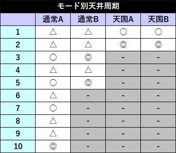 通常A・通常Bは奇数周期がチャンスで、通常Bは5周期目が天井となる。天国は2周期目が天井となり、天国ABの違いはループ率でAよりBのほうがループ率は高い。