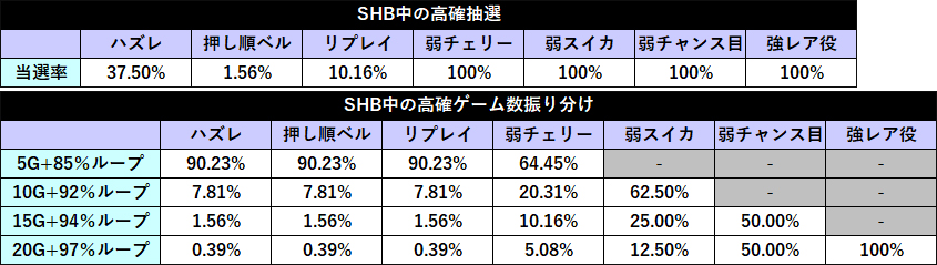 SHB中に上記表の役が成立した時、高確抽選を行う。弱チェリー以上成立時なら必ず高確に移行する。