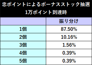忠ポイントが1000ポイント毎にボーナスストック抽選を行う。7000ポイント以上は必ず1個以上ストックする。