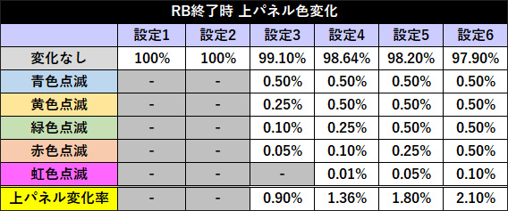 レギュラーボーナス(RB)終了時に上パネルの色が変化すれば設定3以上濃厚。色は「青<黄<緑<赤<虹」の順に高設定期待度がアップし、虹色なら設定4以上濃厚。