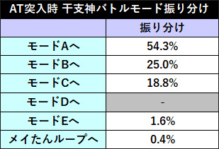 AT中は内部的に「干支神バトルモード」が6種存在し(モードA~モードF)、滞在モードに応じて干支神バトルの対戦キャラを抽選。モードは【AT突入時】【干支神バトル消化後】に移行抽選が行われ、バトル後は勝敗に応じて移行率が変化する。