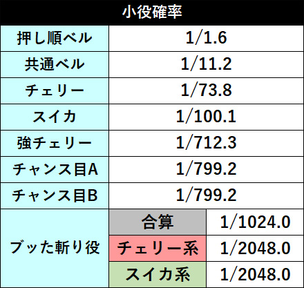 小役確率に設定差はなし。チェリーは基本的に前兆移行役、スイカは基本的に状態移行&特殊高確移行のメイン契機、チャンス目・強チェリーは必ず1段階以上の上位モードに移行する。