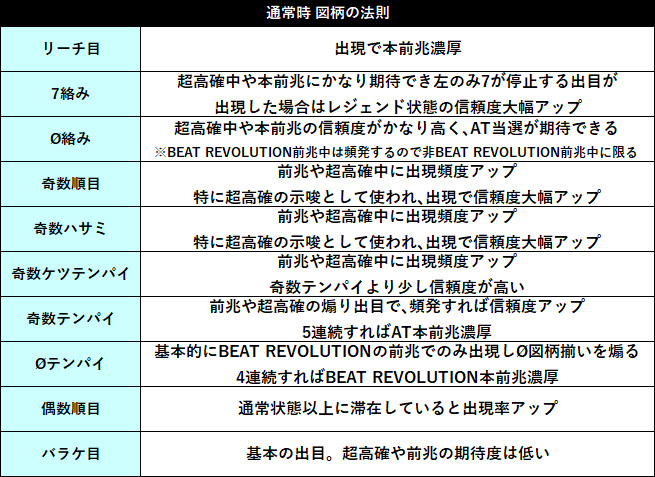 通常時のモードは、ATやBEAT REVOLUTIONの移行抽選に影響する「通常モード(通常<高確<超高確)」と、ATに当選するとAT「LASTGIGS」への移行が濃厚となる「レジェンドモード」が存在。
