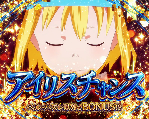 タイトル色を除くチャンスアップの出現回数で期待度が変化。チャンスアップは、「レバーON時の炎エフェクト+セリフ青文字」「第3停止時のセリフ青文字」などが該当する。その他、アイリスランプ点灯=レア役示唆でレア役否定ならボーナス本前兆確定!? 下パネル消灯=ボーナス本前兆確定!?通常時の連続演出 チャンスアップ出現回数別信頼度 0回 1回 2回 3回 第8メンバーに料理を作れ! 約1% 約7% 約41% 約86% ゴールに辿り着け! 約8% 約42% 約83% 新たな技を習得しろ! 約9% 約45% 約91% バーンズから一本取れ! 約2% 約28% 約72% 約94% 試験場から脱出しろ! 約5% 約59% 約92% 約98% -