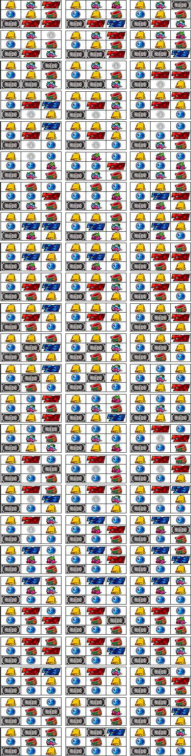 小役別BONUS当選期待度 設定1 設定2 設定3 設定4 設定5 設定6 チェリー 8.6% 9.4% 9.8% 11.3% 12.9% 13.7% スイカ 0.4% 0.4% 0.8% 1.2% 1.2% 1.6% リーチ目 100% 100% 100% 100% 100% 100%