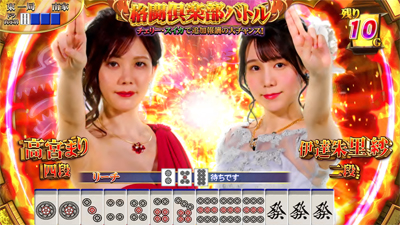 テンパイ時のタイトルランプ点灯 点灯数 ツモ運 レベル1 レベル2 レベル3 レベル4 麻雀 〇 〇 〇 〇 麻雀格 〇 〇 〇 〇 麻雀格闘 - 〇 〇 〇 麻雀格闘倶 - - 〇 〇 麻雀格闘倶楽 - - - 〇 麻雀格闘倶楽部 勝利濃厚⁉ テンパイ(リーチ)時にCHANCEボタンを押すと、筐体上部のタイトルが点灯。点灯した数が多いほど、高ツモ運レベルが期待できる。 -