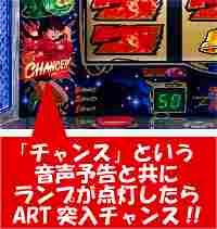 この間は液晶右上隅のART残りゲーム数表示が「闘志」に変わり、ゲーム数の分岐点で闘志の文字が消えなければ継続(10Gで消えなければ30G以上)確定となる。