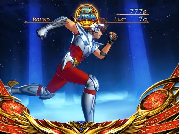 継続ゲーム数10G+バトル・1ゲーム約2.8枚純増のAT。最大3回のバトルを突破し、AT「聖闘士(セイント)RUSH」突入を目指す。