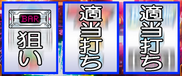 逆押しで右リール上段に赤7図柄を、中リール上段にBAR図柄を狙い、左リール上段にBAR図柄をビタ押し。
