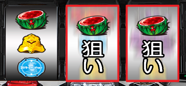 上段にスイカが停止した場合は、中・右リールにスイカ図柄を狙う。