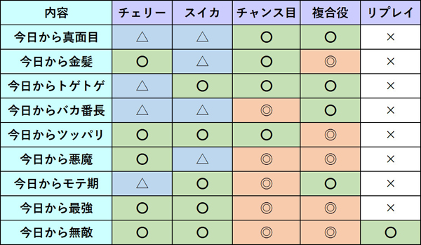 液晶右上に存在する今日俺スケジュールの内容によって成立役による俺メーター点灯期待度が変化。また、対応役も存在しており、対応役成立時は俺メーターが点灯!?