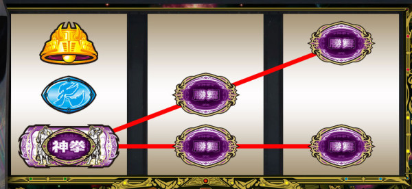 レア役成立時は、あべし加算の特化ゾーン「天破の刻」やAT「闘神演舞」突入などに期待でき、小役の入賞パターンで期待度が異なる。