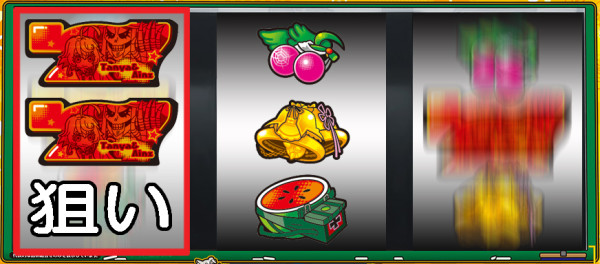 中リール停止後は、左リール枠内に2連赤7図柄を狙う。