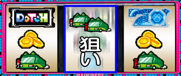 第1リール(中リール)にBAR図柄を狙い、残りのリールも2択当てでBAR図柄を狙う。2択当てに成功すればBAR図柄が揃い、ボーナス当選濃厚。