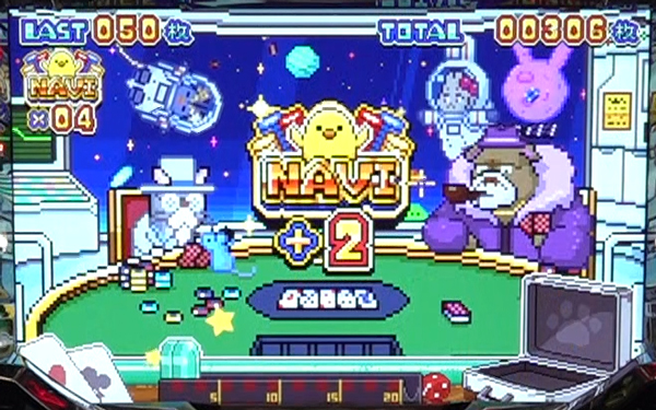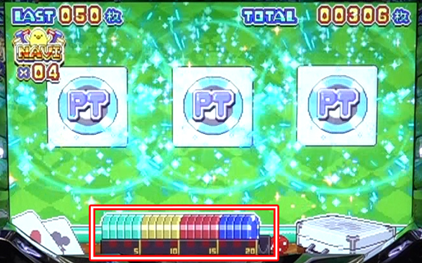 獲得したポイントは液晶内下部に蓄積され、20pt獲得ごとにベルナビ回数を上乗せする。
