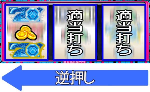 逆押しで右・中リールを適当打ちし、左リールに「青7・ベル・青7」のサンド目をアバウトに狙う。
