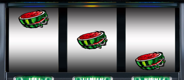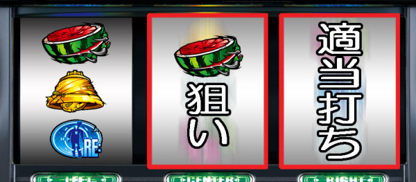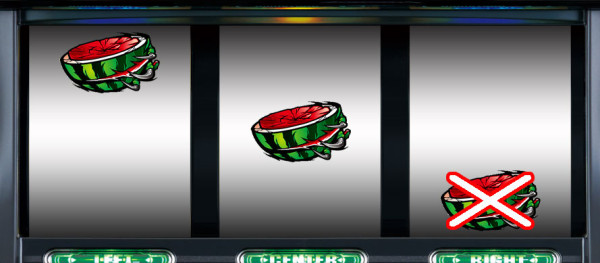 スイカが停止した場合は、中リールにスイカ図柄を狙い、右リールを適当打ち。