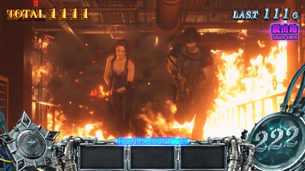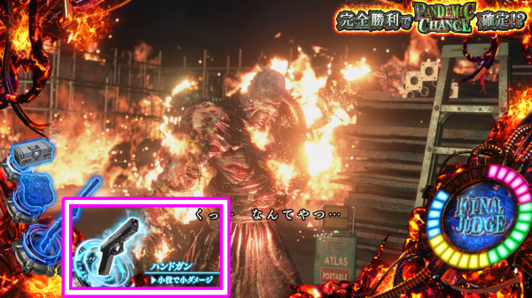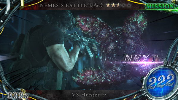 通常時は、大きくレア役契機と規定NE-ポイント契機の2ルートからCZ「NEMESIS BATTLE」へ突入し、BONUS&AT「HAZARD RUSH」を目指す。