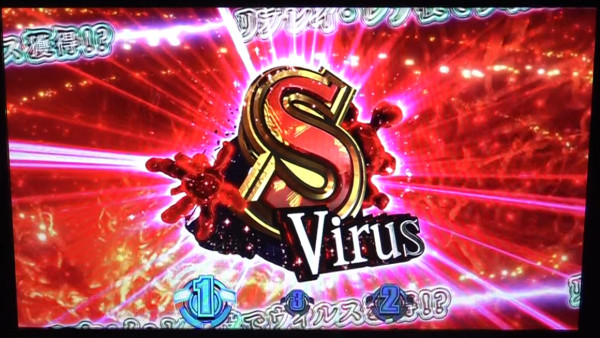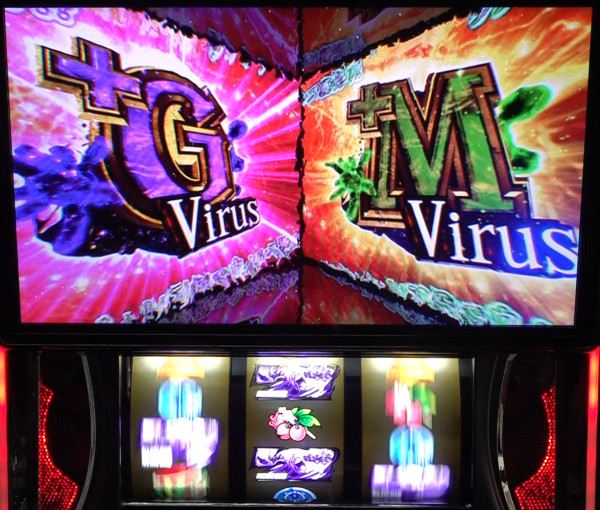 ウィルスマスで狙え演出が発生し、ハザード目(「紫7・チェリー・紫7」のサンド目)が停止すれば、当該ウィルスと+Mウィルスを獲得。