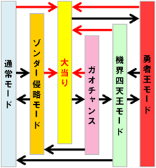 通常時の[3][7]図柄以外の大当り後に突入する、電サポ10or20回転のモード(確変or通常)。滞在中に図柄揃い大当りを引き当てれば、次回大当りまで電サポ継続の確変「勇者王モード」へ突入する。
